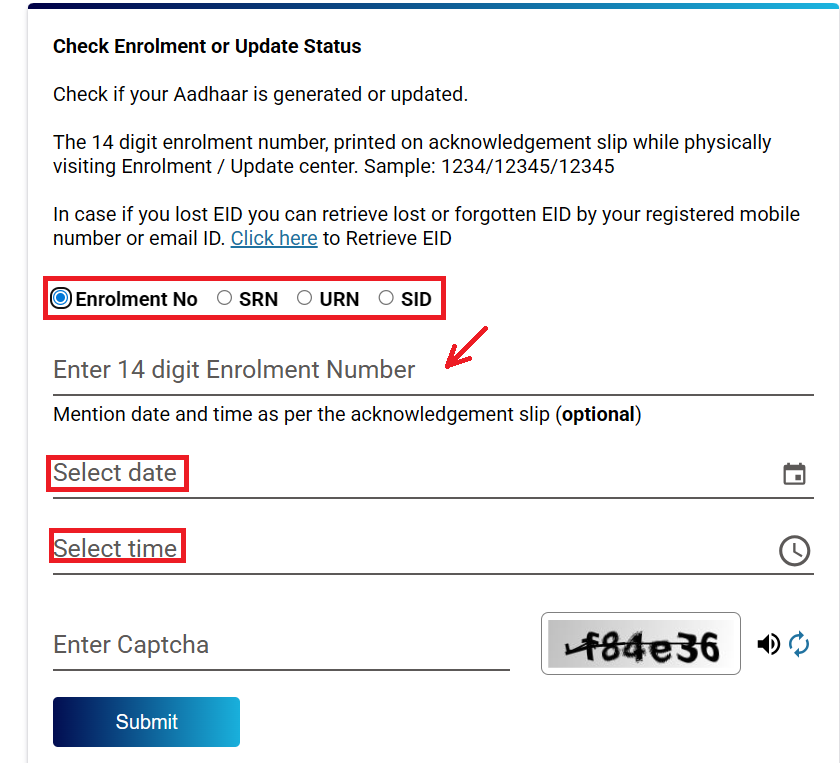 - Enter Enrolment Details: Input your 14-digit Enrollment Number (first part of the 28-digit EID) and the 14-digit Date/Time stamp (format: DD/MM/YYYY HH:MM:SS) exactly as on your acknowledgement slip.